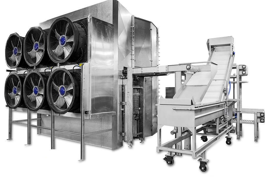 A esteira totalmente inoxidável garante excelente higienização no processo, pois possui sistema de lavagem contínua. A ventilação é horizontal, mantendo a homogeneização do ar em todo o produto. O produto ao sair do túnel está pronto para ser embalado e armazenado em câmara de estocagem de congelados ou resfriados.